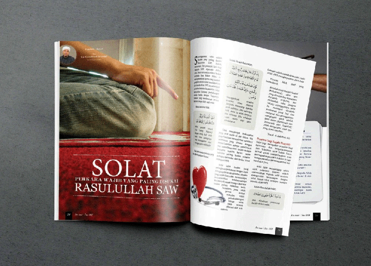 The interior spread showcases a thoughtfully composed article titled “Solat: Perkara Wajib yang Paling Disukai Rasulullah SAW.” The design balances impactful imagery with structured text columns, integrating Arabic script, illustrations, and modern grid-based alignment to ensure readability and aesthetic harmony.